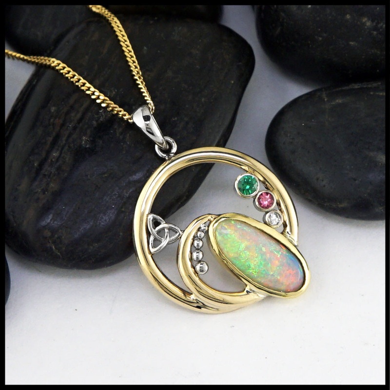 Custom 14K Yellow frame pendant with 14K White Gold Trinity, bead and knot details. Pendant is set with a 1.15 CT Opal with Tsavorite, Pink Tourmaline and Diamond accents.
