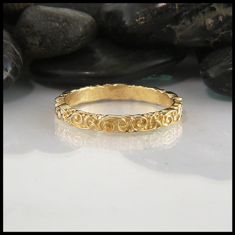 The Trinity Scroll stacking ring is aCeltic gold ring, designed byWalker Metalsmiths designerLyndsay B. This ring consists of trinity knots, spirals, and scrolls that interweave throughout one another.This ring is available in your choice of 14K Yellow, White, and Rose Gold.