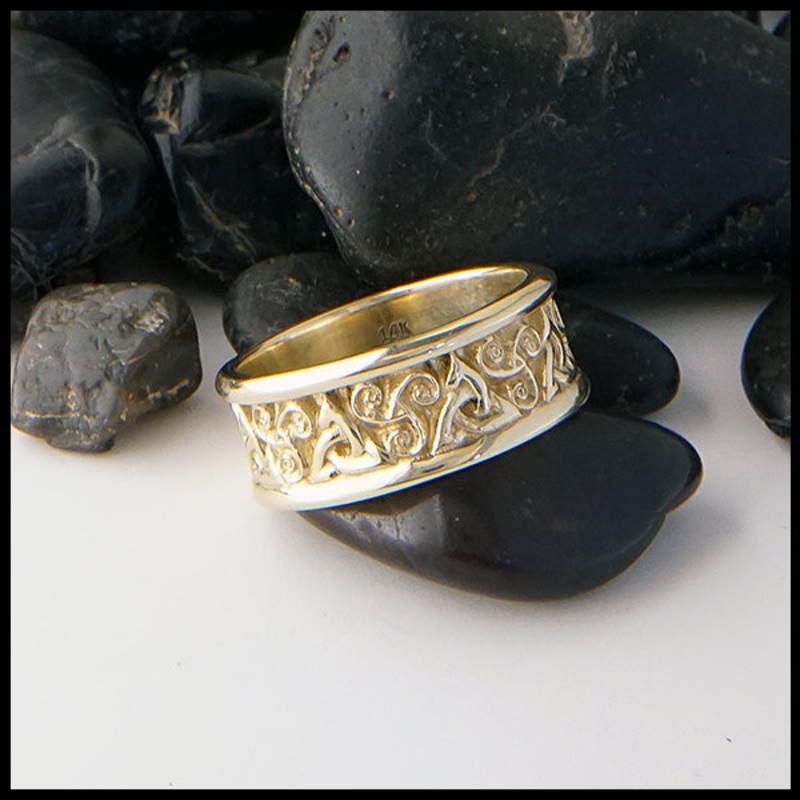 Celtic ring available in 14K Yellow, Rose or White Gold. This ring has two rails and the interior is alternating Trinity Knots and Triskeles.