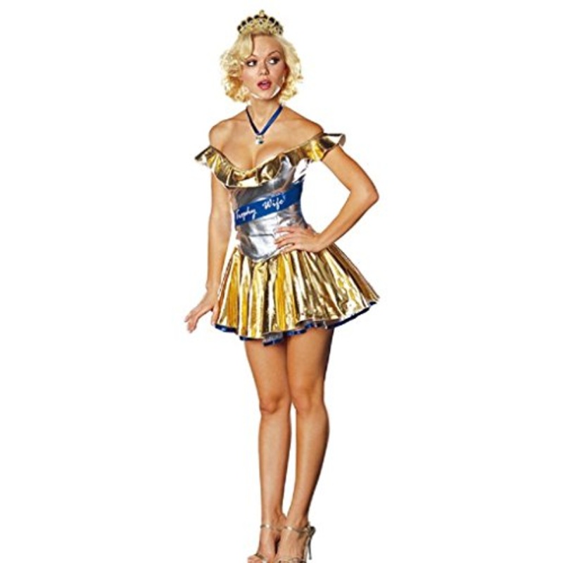 3 piece set includes: Gold metallic dresswith attached tulle petticoat, attached"Trophy Wife" Sash, jeweled tiara and diamond ring necklace.Size: S (2-6), M (6-10), L (10-14)Being the ultimate prize, this hottie wife in her metallic dress,isaccustomed to b