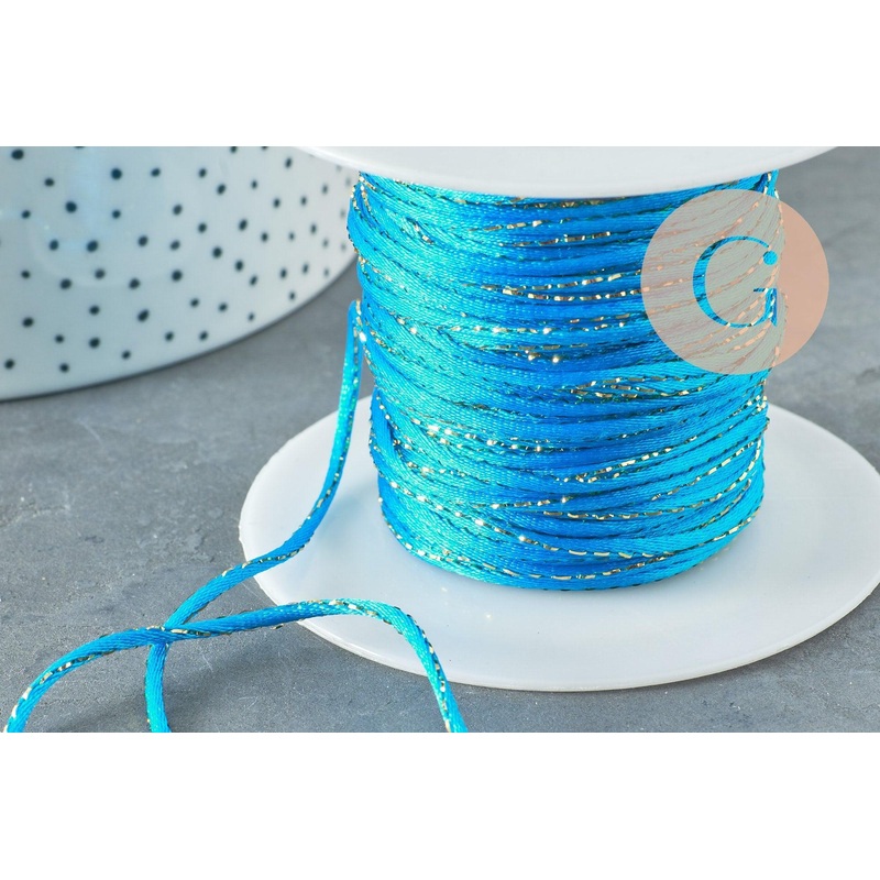 To make your jewelry, accessories, bags and clothes or for scrapbooking and other creative hobbies, we offer 1 meter of turquoise blue nylon cord enhanced with a gold thread. 1.5mm diameter The thread/ribbon comes rolled up on a cardboard card. In case of