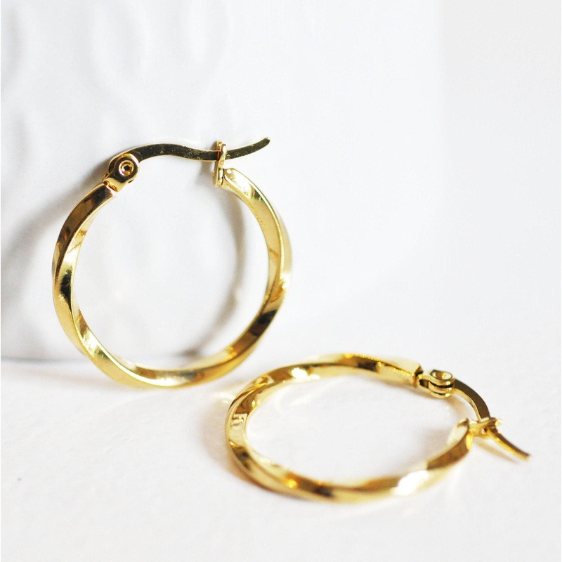 twisted gold-plated steel hoop earrings, gold-plated jewelry, jewelry creation, pierced ear, nickel-free, pair, steel earrings, 25mm