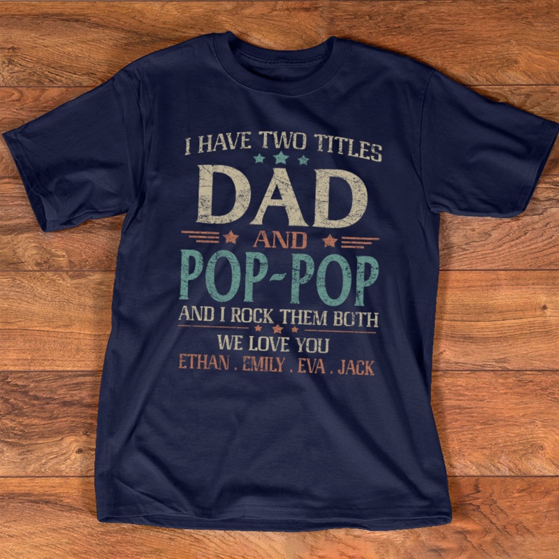 Two title Dad and Pop Pop KidsGreat as Birthday gifts or Holiday presents. This adorable item can be designed upon anyone's wish with any title.Please enter:1. Nickname: Papa, Grandpa, Pawpaw, Pop-Pop, Papaw ...etc.2. Kids' Names wanted on the shirt (Names
