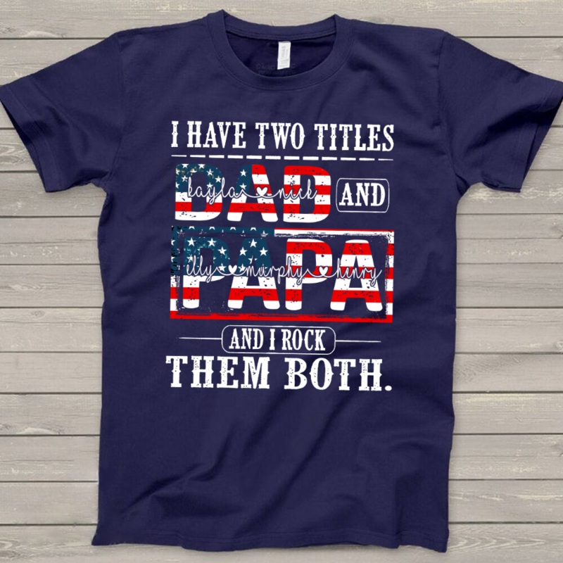 Two titles Dad and Papa Kids FlagGreat as Birthday gifts or Holiday presents. This adorable item can be designed upon anyone's wish with any title.Please enter:1. Nickname: Papa, Grandpa, Pawpaw, Pop-Pop, Papaw ...etc.2. Kids' Names wanted on the shirt (Na