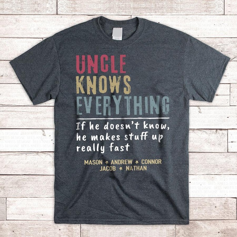 Uncle Knows Everything ||| T-ShirtGreat as Birthday gifts or Holiday presents. This adorable item can be designed upon anyone's wish with any title.Details Brand: Gildan Classic unisex cut makes this easy to fit the body.Material: Heavyweight fabric- Sport