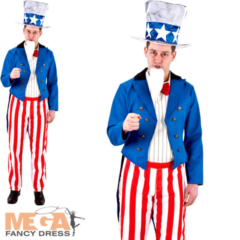 Uncle Sam Mens Costume Includes Tailcoat Shirt Front with Attached bow Tie Trousers Hat Beard Size One Size Up to 44" Chest