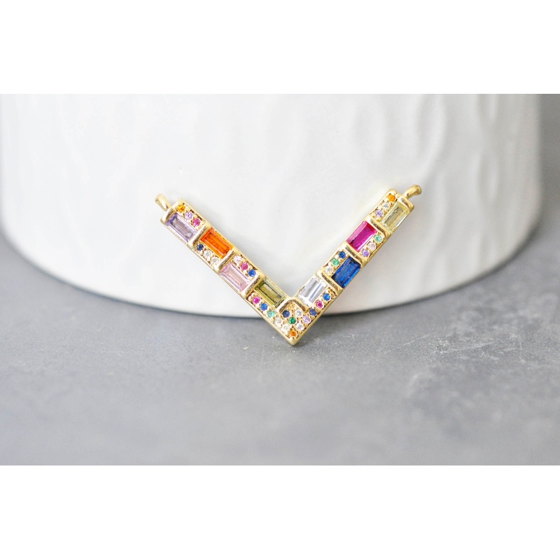 To make magnificent necklaces, earrings and bracelets, adopt this V-shaped connector pendant, decorated with colored zircons Dimensions Length: 33.2mm Width: 20mm Thickness: 3mm Hole: 1.4mm Sold individually. This timeless pendant can be worn on one of our