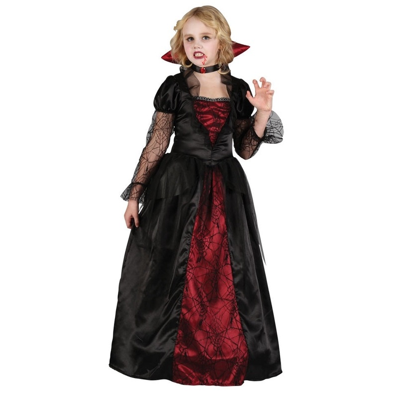 Deluxe Vampire Princess Halloween Costume Turn your little girl into blood sucking gothic vampire royalty with our gorgeous deluxe quality Girls Vampire Princess fancy dress costume. Features a full length black satin look material ball gown with crimson p