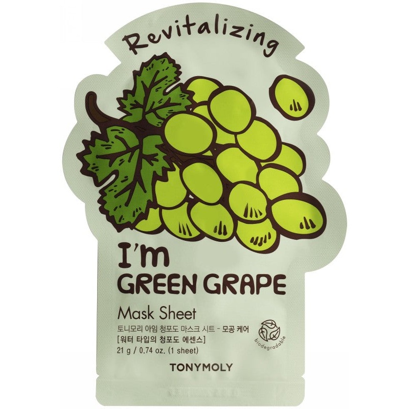 TONYMOLY Im Green Grape Mask Sheet veido kaukje esantis vynuogi ekstraktas pasiymi antioksidant gausa, padeda viesinti ir atgaivinti od, suteikia jaunatvik spindes.