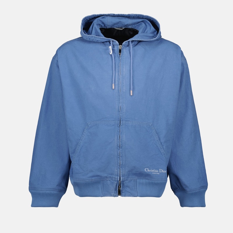 Veste en denim bleu de Dior pour homme, issue de la collection Printemps-t 2025. Elle prsente un col montant, des manches longues et un logo brod sur le devant.