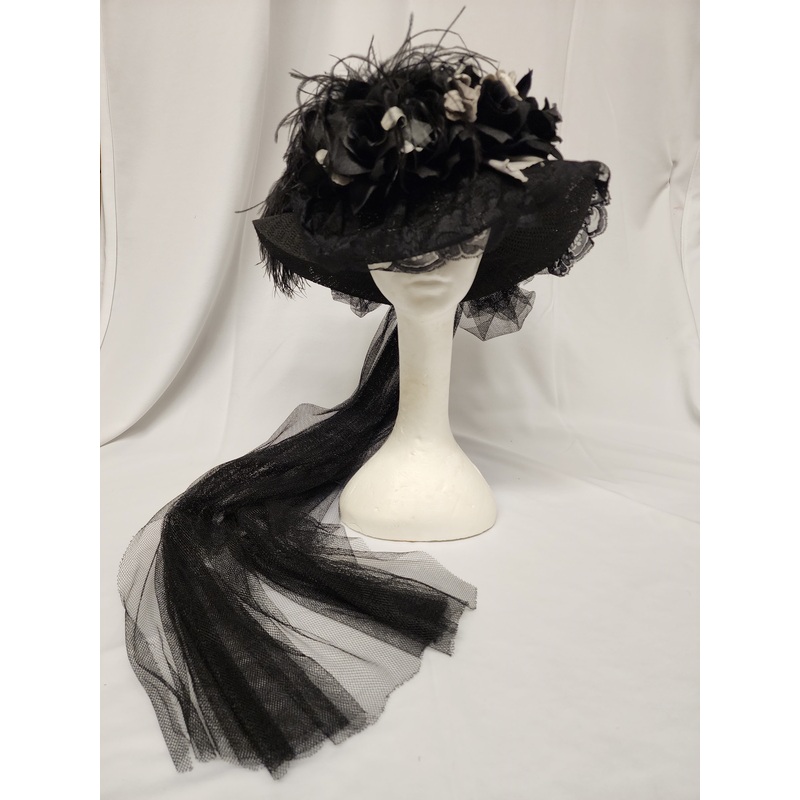 Black Felt Large Brim Hat w/Black Flowers, black satin band & bow, black flowers, black ostrich & English netting train & bow down the back.