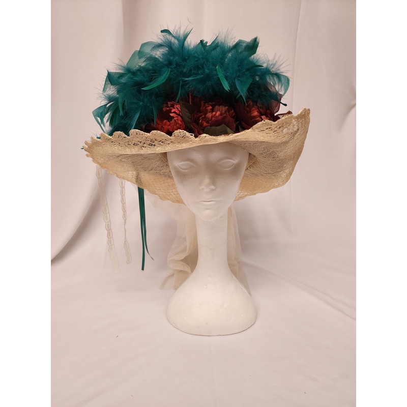 Vintage Elsie Massey OriginalLight weight & very elegant.Beautiful Lace Sinamaymesh straw brim w/hunter green satin pleated crown, front burgundy & mauve flowers, burgundy floral organza ribbon bows, hunter green feathers & finished off with Ivory English