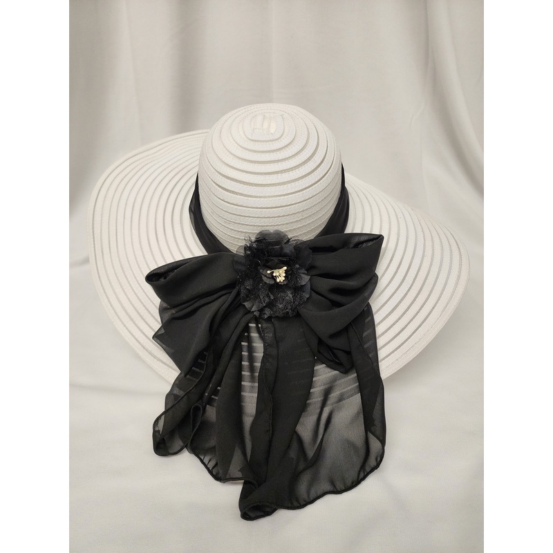 Elegant white straw sheer mesh large brim w/spiral design,beautiful soft chiffon scarf band tied around the crown, big white chiffon bow & lace flower in the back.