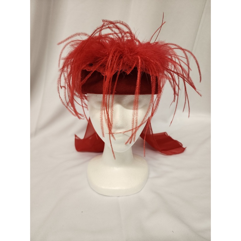 Ivory felt French hat w/Ivory venetian lace around the crown, antique peach flowers, champagne ostrich feathers & an Ivory English netting train down the back. This hat is worn pinned on top of the head or off to the side.Color: IvorySize: One Size Adult