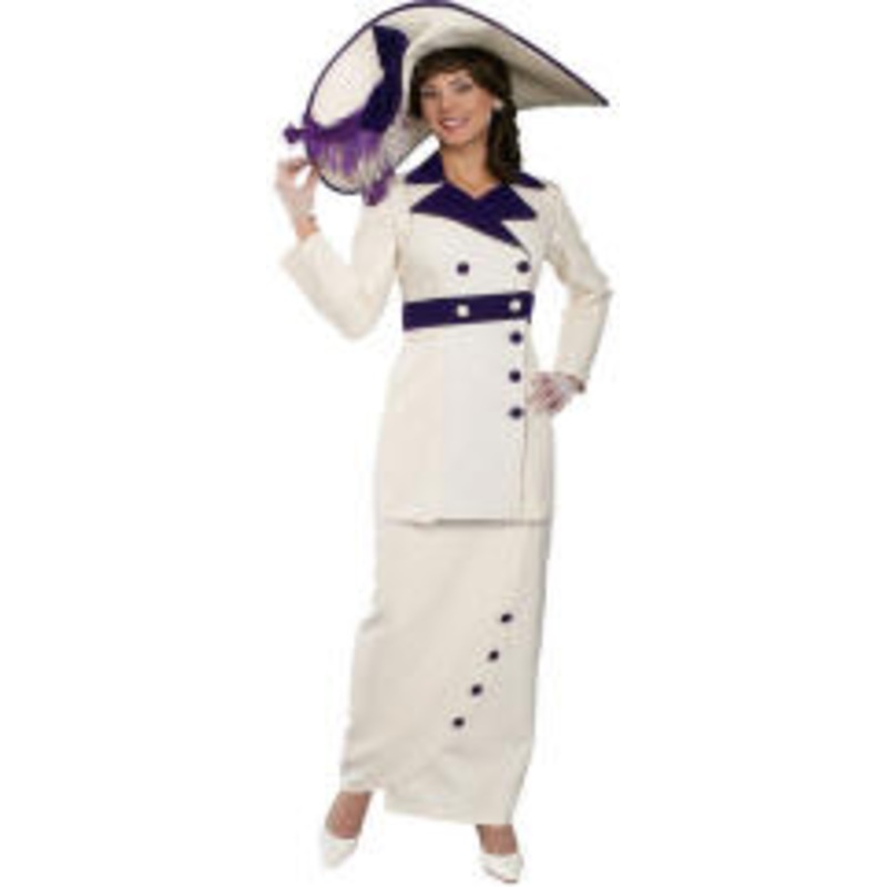 Includes: Includes poly cotton hat with plumes, matching 3/4 length jacket and full length skirt with contrasting buttons.