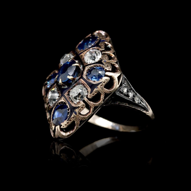 Vintage 14K Yellow Gold Estate Sapphire, Enamel and Diamond RingThe ring is set with five oval cut sapphires, approx. 1.50cttw.Four old mine cut and six rose cut diamonds, approx. .60cttw., G-H/SI-I1Size 6