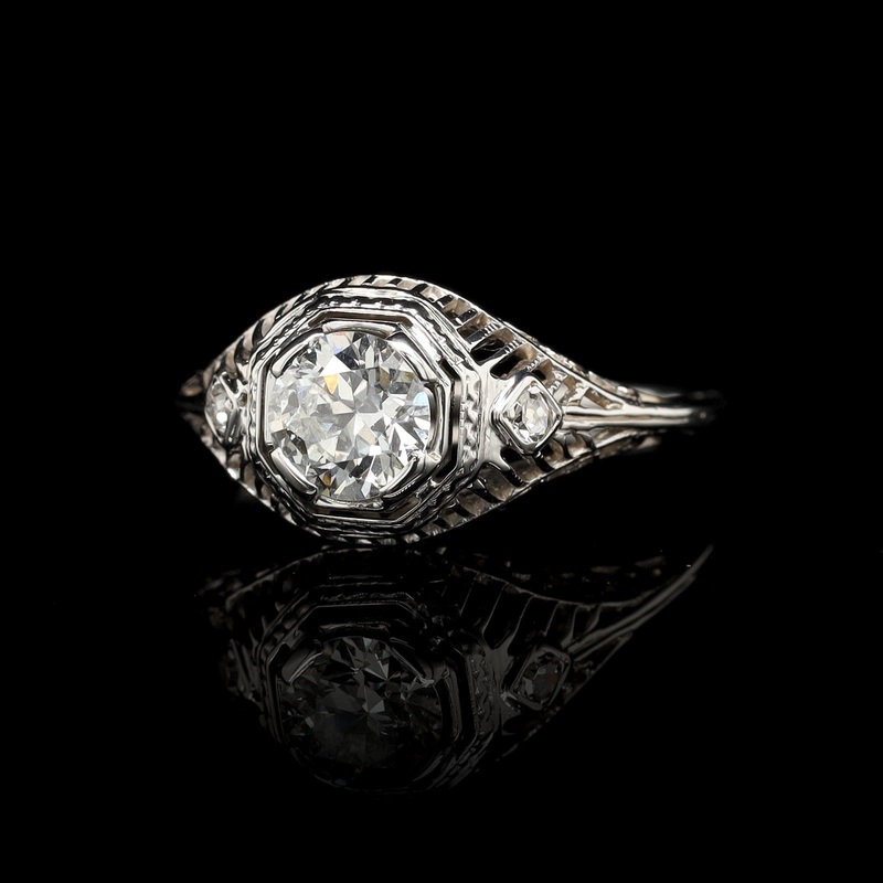 Vintage 18K White Gold Estate Diamond Engagement RingThe ring is set with one old mine cut diamond weighing approx. .67cts., H-I/SI2And two single cut diamonds, approx. .03cttw.Size 6 3/4