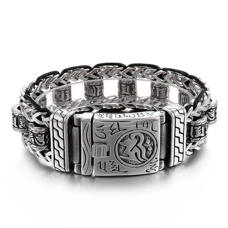 Vintage-Inspired Leather Braided Chain Bracelet, Men’s Punk Titanium Steel Hollow Six-Character Mantra Bangle