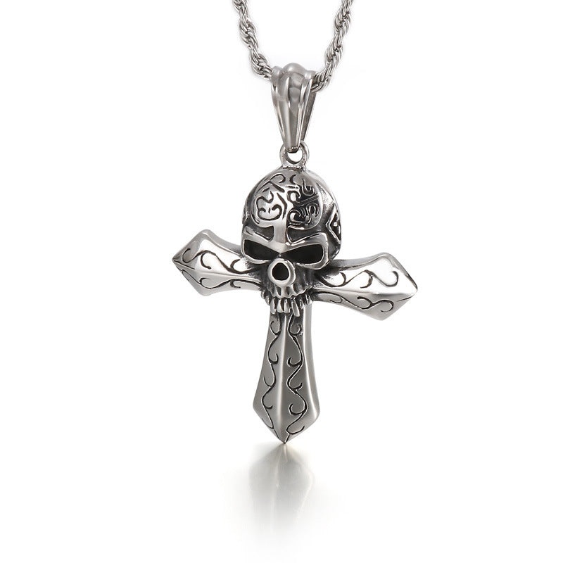 Unleash your inner rebel with our striking European and American Retro Old Domineering Cross Skull Pattern Ghost Head Men’s Stainless Steel Pendant. This pendant is not just an accessory; it’s a bold statement of individuality and strength.