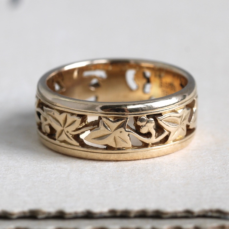 A beautifully detailed vintage band crafted in solid 18k yellow gold showcasing the centuries-old language of flowers with its articulated ivy motif.
