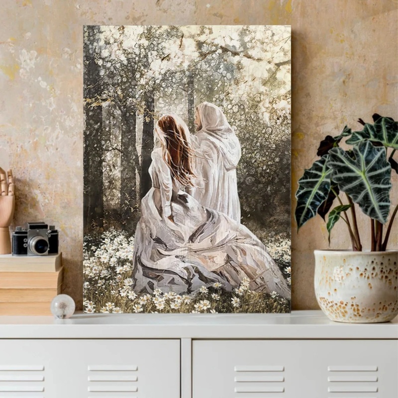 Walking with Jesus, Beautiful girl painting, In the forest, Among the flower field - Jesus Portrait Canvas Prints, Christian Wall ArtCute Gift for Mom, Dad, Grandma, Grandpa, Family, and Friends. It will bring a smile to their face. Its perfect for the hom