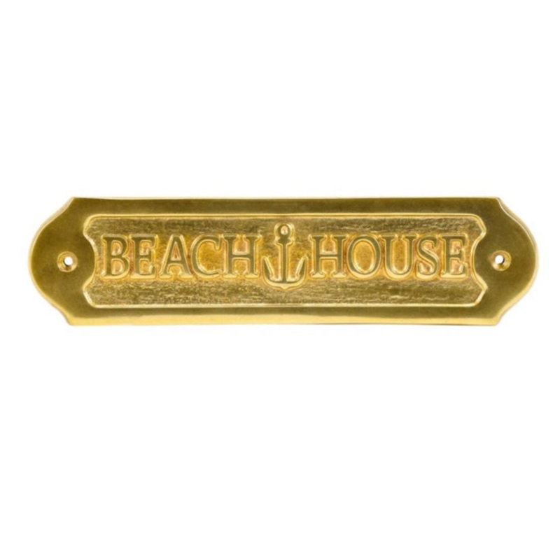 The nautical wall decor features an antique brass finish over a "Beach House" sentiment and anchor design. Beach inspired design and sentiment is embossed for added dimension. The plaque is easy to hang via predrilled holes on each side.