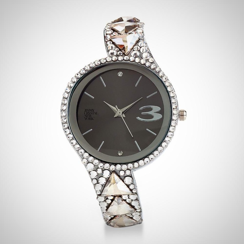 Elegant silver-tone watch featuring sparkling crystals accents on both the bezel & bangle Embellished with crystals, which are set by Jimmy Crystal's expert craftsmanship. This product provides unparalleled aesthetics to transcend elegance. Mineral gla