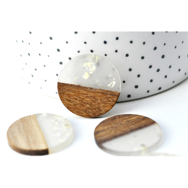 Disc-shaped beads with a very simple appearance, made of wood and resin decorated with iridescent glitter which can make very pretty pendants or complete earrings in an arty spirit.