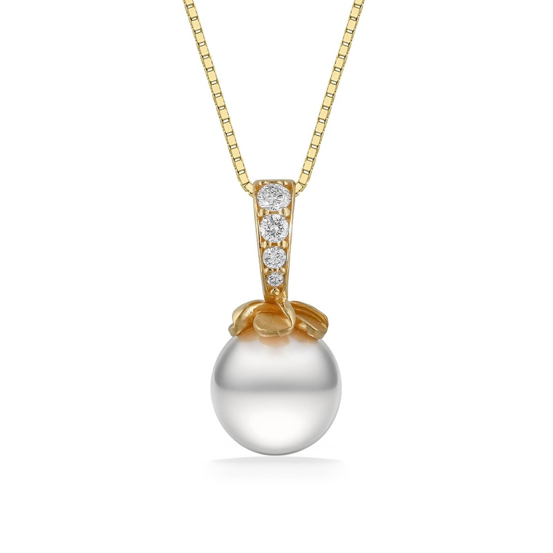 White Akoya Pearl Plumeria Diamond Bail Pendant, 7mm 14K Yellow Gold