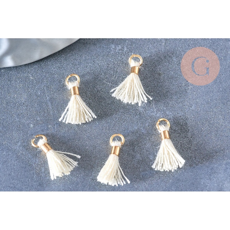 White ecru polyester pompom with gold backing, pompom loops, bohemian jewelry making, 10-16mm, 5 (G4546)