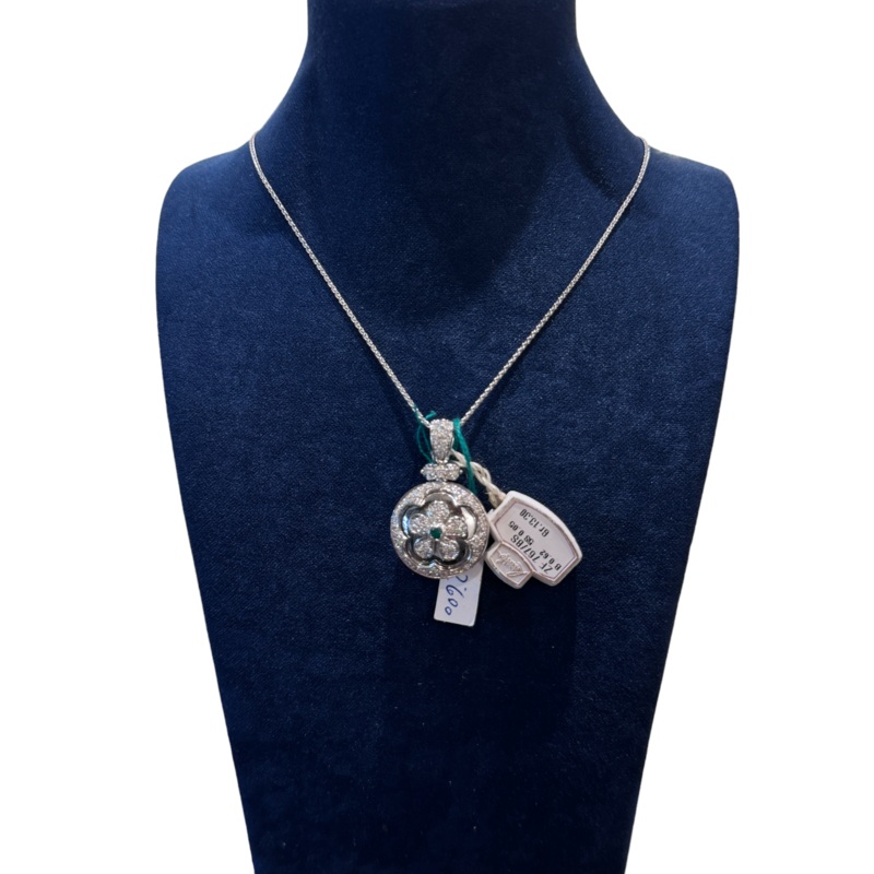 18kt white gold and diamond necklace with central emerald Flower-shaped pendant. Diamonds 0.62ct Emerald 0.05ct Color F Purity VS Length 45cm