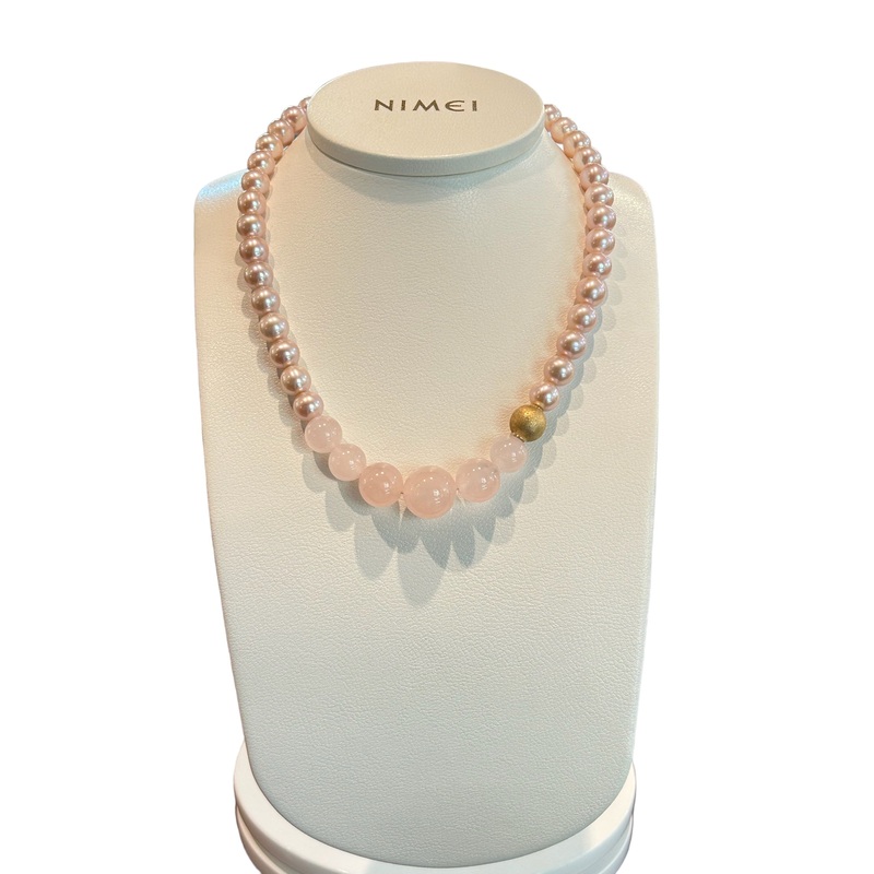 Nimei women’s necklace with natural pearls in white, pink and yellow gold, with 18k yellow gold clasp.