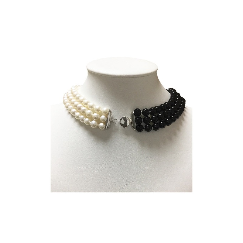 Nimei women's necklace with natural white pearls, black onyx and 18k white gold clasp. Nimei women's choker necklace, with natural white pearls, black onyx spheres and 18k white gold clasp. Material: 18K White Gold, Natural Pearls, Black Onyx