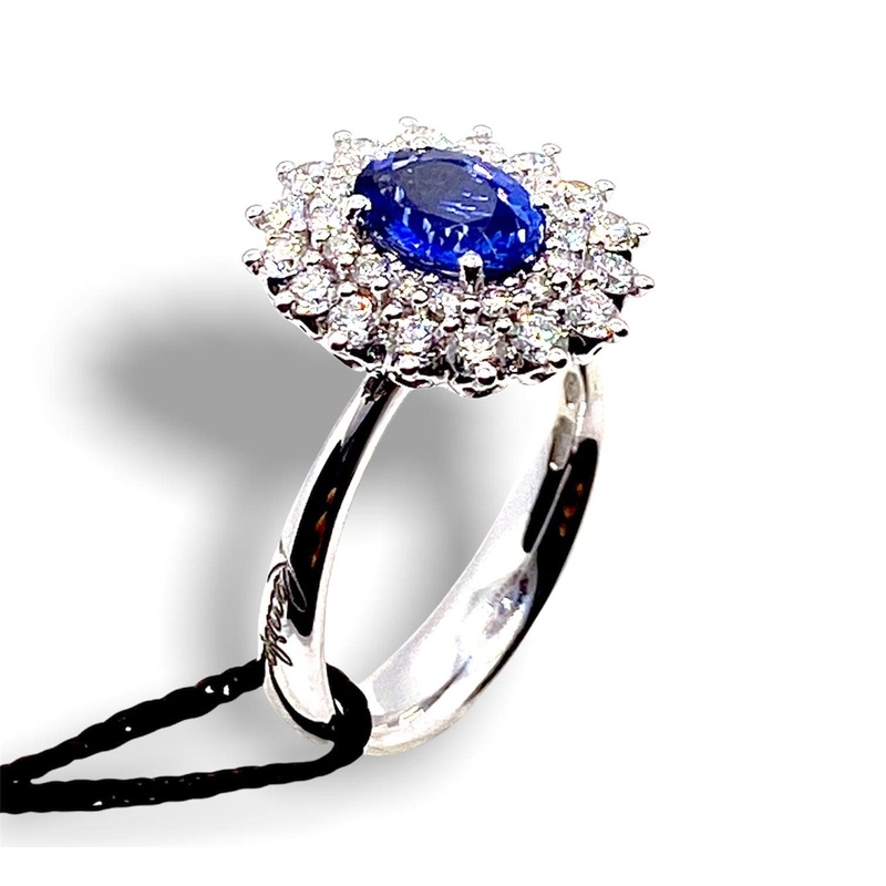 Ring in 750% 18KT White Gold with natural oval cut sapphire 1.30 Ct surrounded by two rounds of natural round brilliant cut diamonds 0.77 Ct F-VS