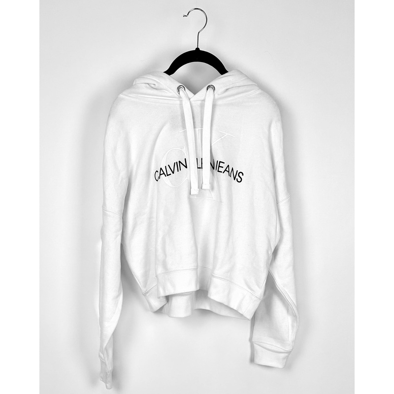 Brand new - donated from the designerCalvin Klein white sweatshirt with hood and drawstring neckline, long sleeves and black and white Calvin Klein logo on front and centerSmall (size 2/4)60% Cotton 40% PolyesterEstimated Retail Price: $55*This is a sample