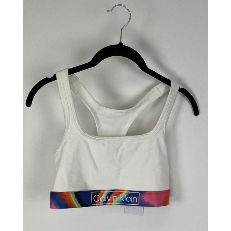 Brand new - donated from the designerCalvin Klein white bralette with multicolor trim with racerback style, stretchy material, and logo on the front and back trimSize Small (4-6)Estimated Original Retail Price: $20* This is a sample piece donated from the