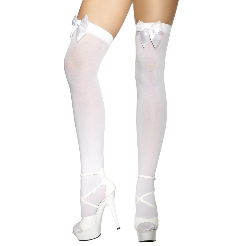 White Stockings With White Bows Add a touch of sexiness to your fancy dress costume with these pretty white stockings. Included is a pair of white stockings decorated with cute black bows. The stockings are available in one size which should fit all. Inclu