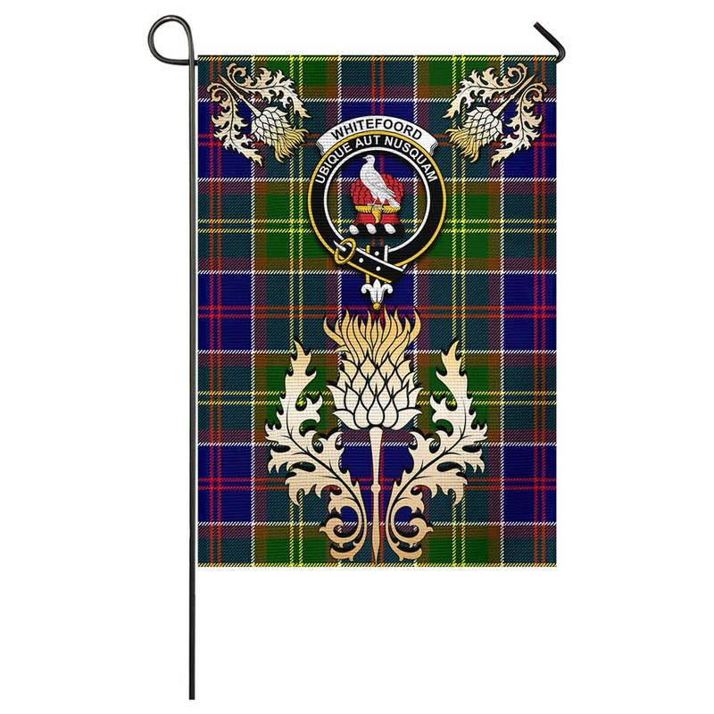 Whitefoord Tartan Garden Flag with Golden Regal Scottish Thistle EmblemEmbrace your Scottish heritage with the Garden Flag a vibrant emblem of culture, tradition, and pride. Designed for those who cherish their ancestry, this flag speaks to everyone who fe