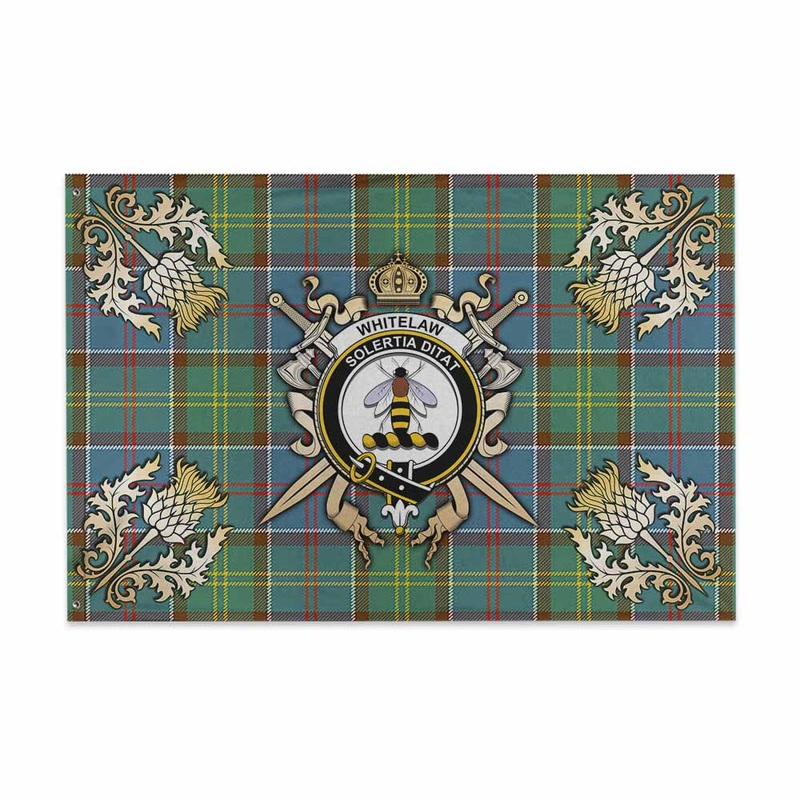 Whitelaw Tartan House Flag with Family Crest and Golden Thistle Crossed Sword Design