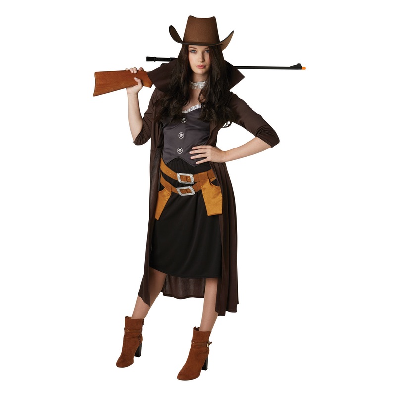 Female Gunslinger Costume Yee-haw, partner, we have a sassy cowgirl on our hands! Change up this Female Gunslinger adult's costume to be a daring and brave hero or a stunning and cunning outlaw - the choice is yours, ladies. With shirt, attached cowboy coa