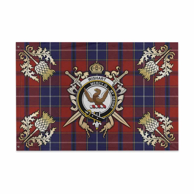 Wishart Tartan House Flag with Family Crest and Golden Thistle Crossed Sword Design