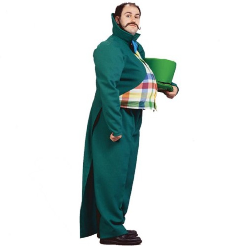 Includes:Green jacket with tails and attached multi color plaid vest,Green elastic waist pants,Bow tie with velcro attachment,Green hat.Polyester/Rayon Blend.Size (Chest/Waist): M (C: 40-42" / W: xx"), L, XL (C: up to 50" / W: up to 42")Munchkin Mayor / Wi