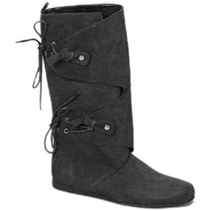 Very good quality brown imitation suede Buckskin boot with brown kid like imitation leather lining and soft foot pad. Two heavy duty side laces and flaps with wide rawhide like ties and chrome studs.This boot works for a variety of characters including Hippies, medieval & renaissance woman, Native Americans, Mountain Woman, early American & European Explorers.