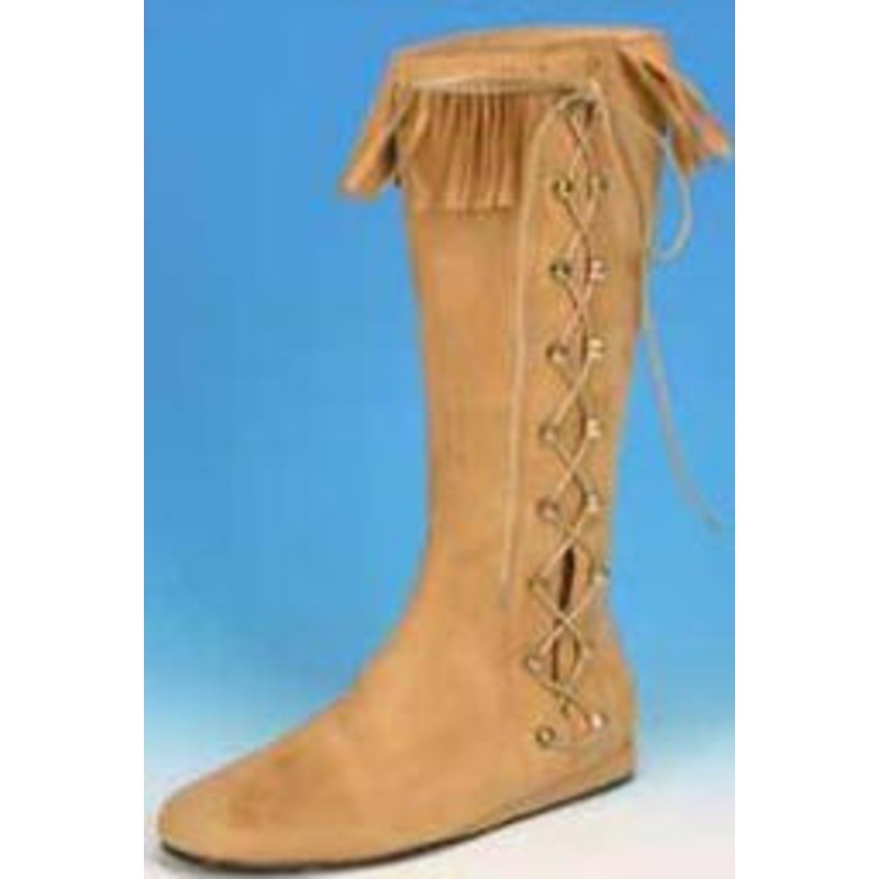 Heavy duty 14″ Side Lace w/metal hooks & inner flap. Very good quality imitation suede Buckskin flat boot with material lining & soft foot pad.3″ leather like fringe decoration at top.Soft comfortable rubber soles. **This boot works for a variety of characters including Hippies, medieval & renaissance woman, Native Americans,