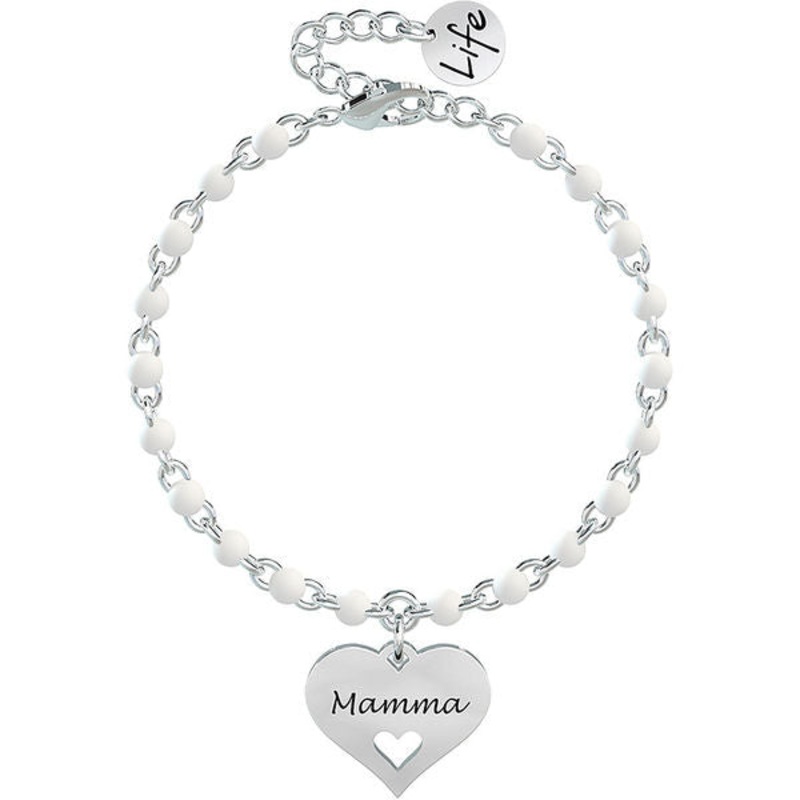 A mother's love cannot be explained, it can only be experienced. Steel bracelet with heart pendant and rol chain with white enamel inserts. Enamelled engraving on the pendant and enamel inserts on the chain Carabiner closure Adjustable size, length from 16