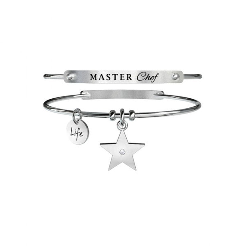 You are the queen of fires, a true genius in the kitchen. The passion to go further to always find new dishes and new tastes that give flavor to life Steel bangle with star pendant. Crystal on the pendant and enamelled engraving on the clasp Bridge closure