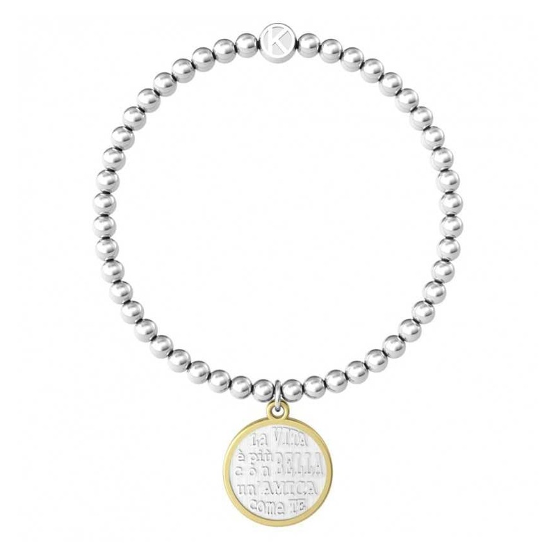 Life is more beautiful with a friend like you Elastic bracelet with steel spheres and round satin pendant with yellow gold finish and crystal. Embossed writing on the pendant and crystal on the back Pendant diameter: 18.6 mm Crystal diameter: 1.75 mm Diame