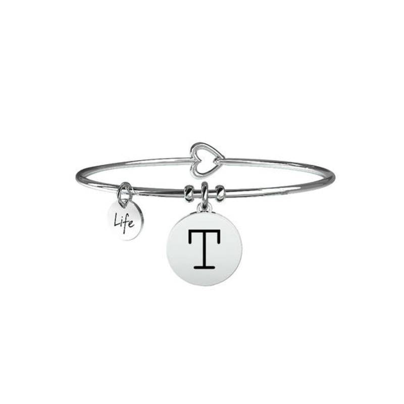 It is the initial of your name, of a special person or someone you care about. Your favorite letter, the beginning of a word, a sentence, a story. Life is an alphabet of emotions. Steel bangle with Initial T pendant. Enamelled engraving on the pendant and