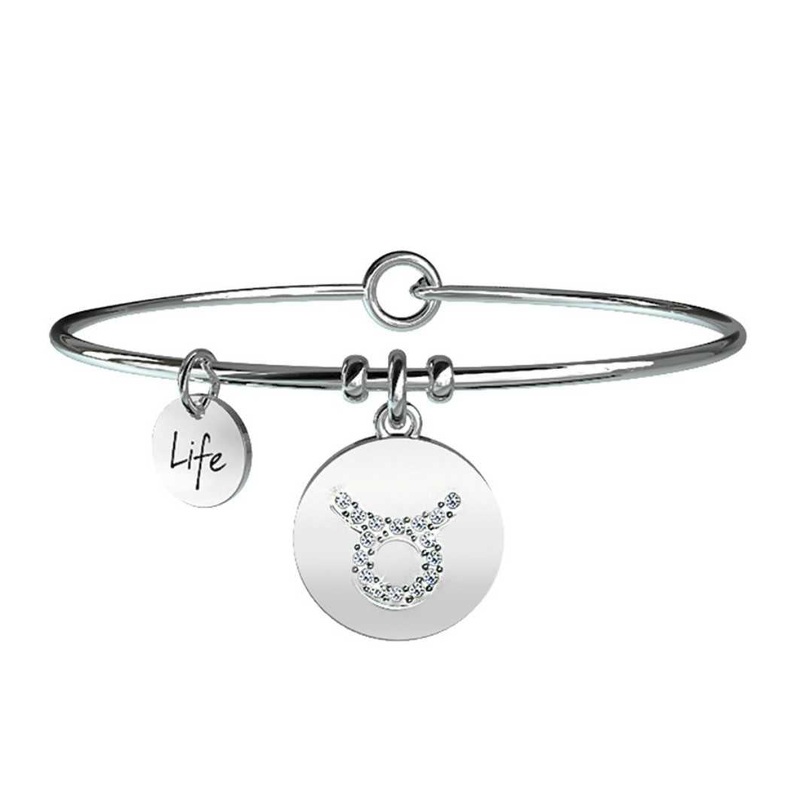 Like the drop that digs into the rock over time, so are you, Taurus. A transparent, luminous person who goes through life with a sensual step, leaving an indelible mark on people. Steel bangle with Taurus pendant. Crystals on the pendant and enamel engravi