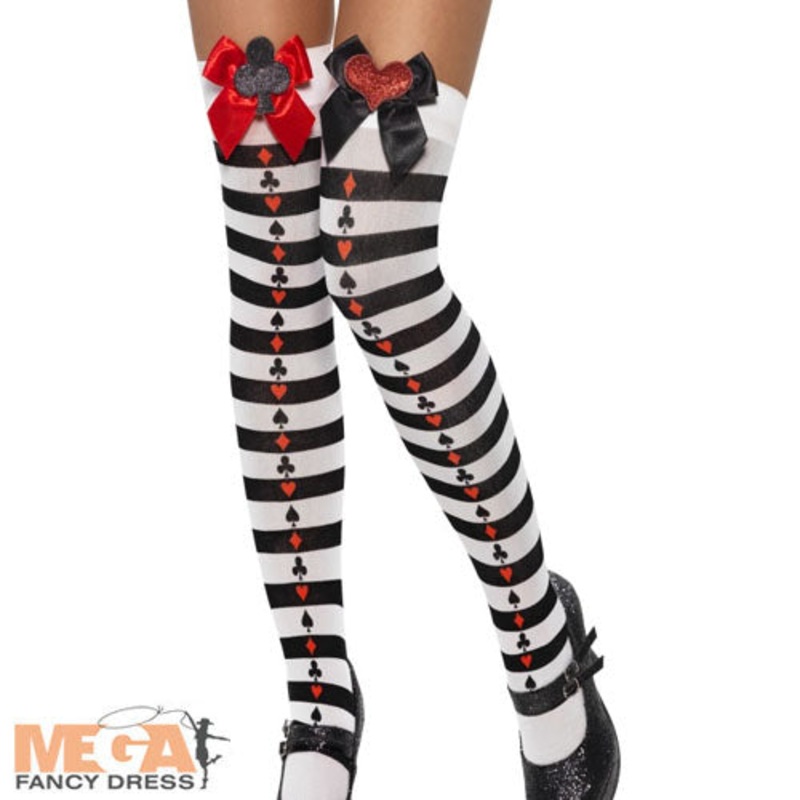 Step into a world of magic with these enchanting Ladies’ Card Fairytale Stockings. Crafted to captivate, these thigh-high stockings boast a mesmerizing design inspired by classic fairytales. Featuring striking black and white horizontal stripes adorned with intricate red and black card symbols, each stocking is finished with an adorable red bow. Whether you’re attending a themed party or simply looking to add a dash of fantasy to your outfit, these stockings are sure to turn heads and spark conversations wherever you go.